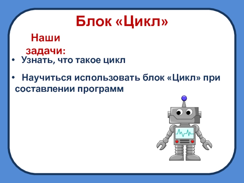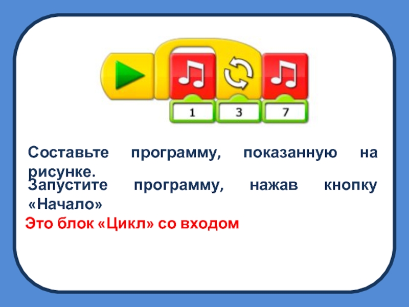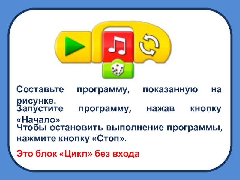 Блок «Цикл» без входа повторяется бесконечно, и чтобы остановить его потребуется нажать кнопку «Стоп». Блок «Цикл» со входом повторяется заданное количество раз.