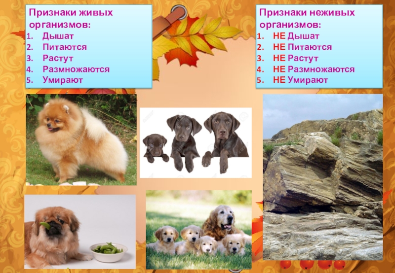 Признаки живых организмов:ДышатПитаютсяРастутРазмножаютсяУмирают Признаки неживых организмов:НЕ ДышатНЕ ПитаютсяНЕ РастутНЕ РазмножаютсяНЕ Умирают