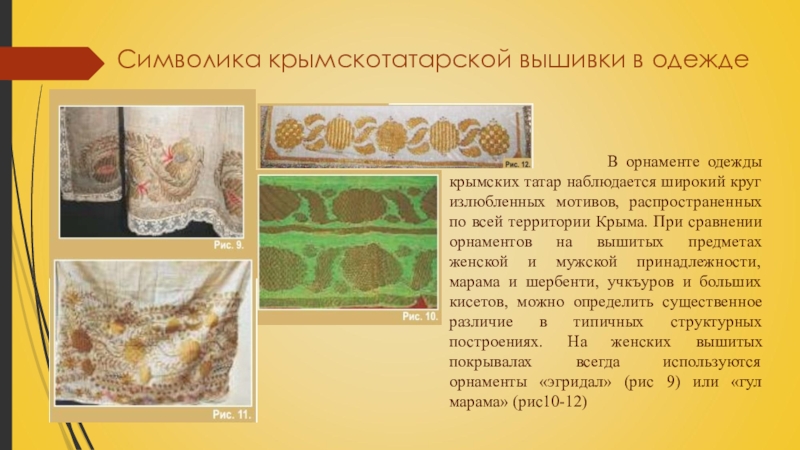 В орнаменте одежды крымских татар наблюдается широкий круг излюбленных мотивов, распространенных по всей территории Крыма. При сравнении орнаментов на вышитых предметах женской и мужской принадлежности, марама и шербенти, учкъуров и больших кисетов, можно определить существенное различие в типичных структурных построениях. На женских вышитых покрывалах всегда используются орнаменты «эгридал» (рис 9) или «гул марама» (рис10-12)