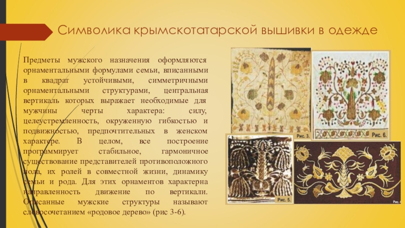 Символика крымскотатарской вышивки в одеждеПредметы мужского назначения оформляются орнаментальными формулами семьи, вписанными в квадрат устойчивыми, симметричными орнаментальными