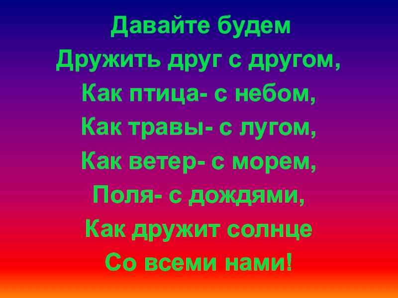 Давайте будемДружить друг с другом,Как птица- с небом,Как травы- с лугом,Как ветер- с морем,Поля- с дождями,Как