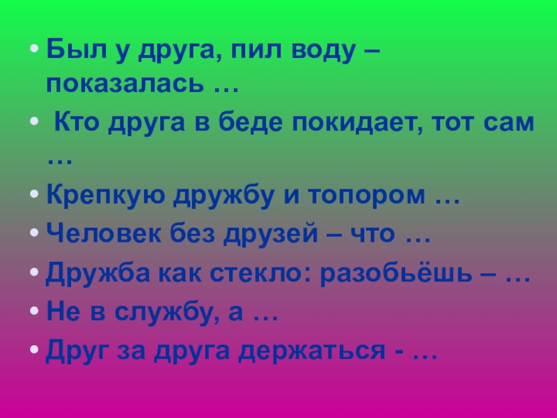 Был у друга, пил воду – показалась … Кто друга в беде покидает, тот сам …Крепкую дружбу