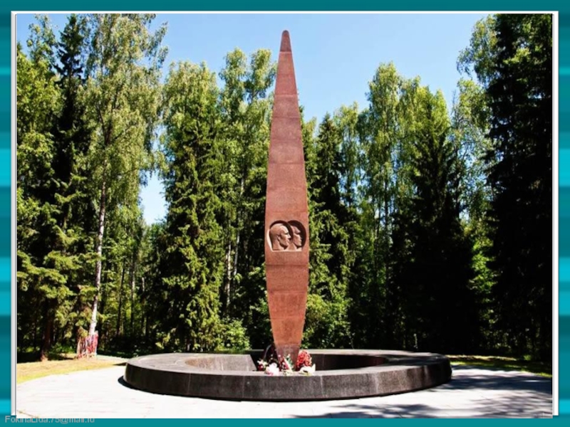 Слайд 23Место гибели Ю. Гагарина и В. Серёгина - Мемориал.