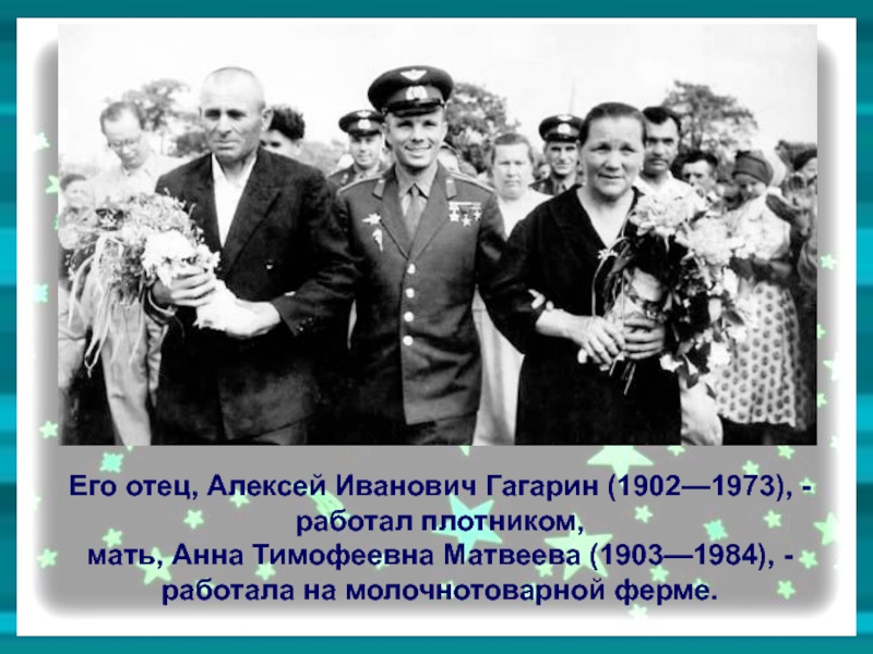 Его отец, Алексей Иванович Гагарин (1902—1973), - работал плотником, мать, Анна Тимофеевна Матвеева (1903—1984), - работала на
