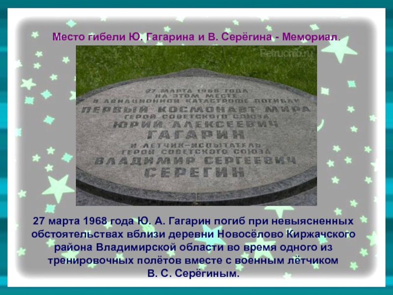 года Ю. А. Гагарин погиб при невыясненных обстоятельствах вблизи деревни Новосёлово Киржачского района Владимирской области во время одного из тренировочных полётов вместе с военным лётчиком