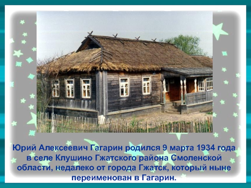 Юрий Алексеевич Гагарин родился 9 марта 1934 года в селе Клушино Гжатского района Смоленской области, недалеко от