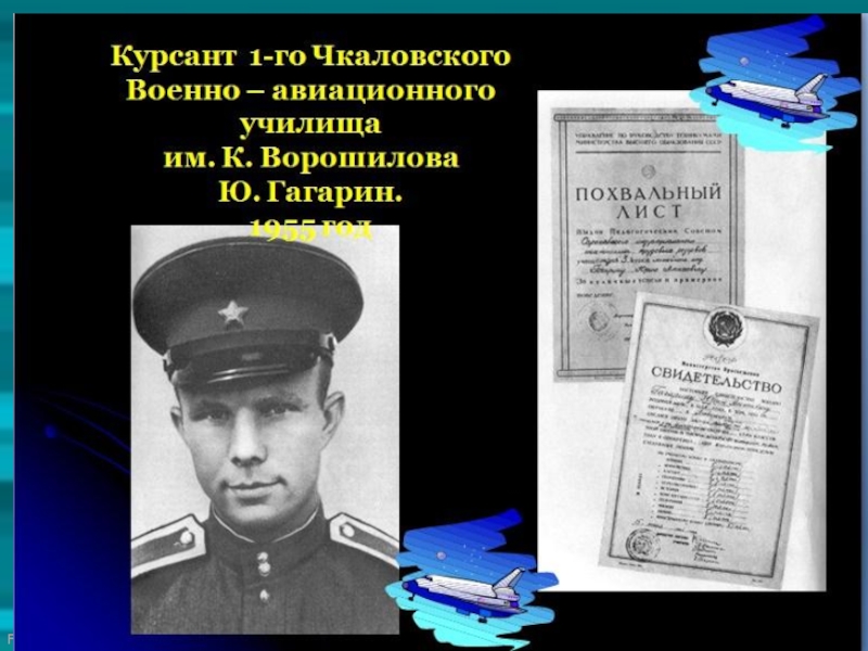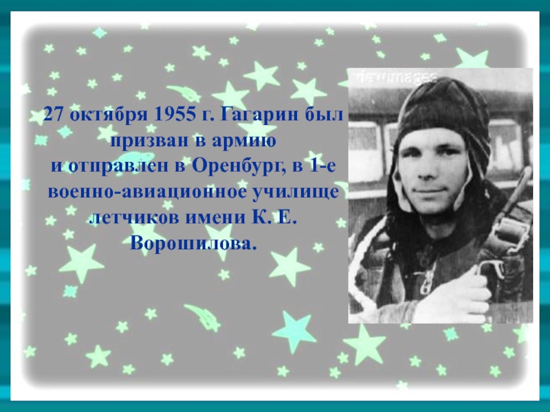 27 октября 1955 г. Гагарин был призван в армию  и отправлен в Оренбург, в 1-е военно-авиационное