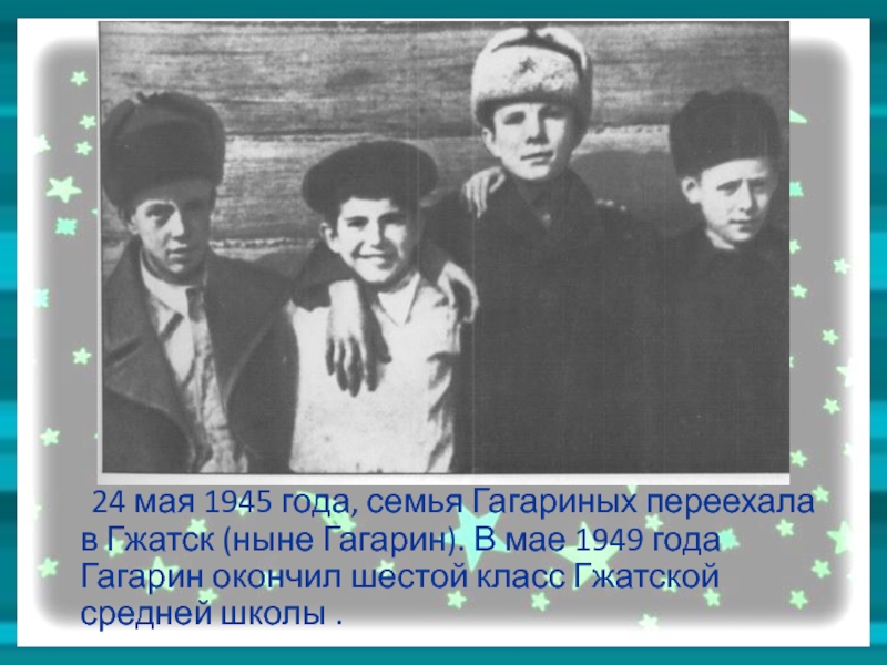24 мая 1945 года, семья Гагариных переехала в Гжатск (ныне Гагарин). В мае 1949 года Гагарин окончил