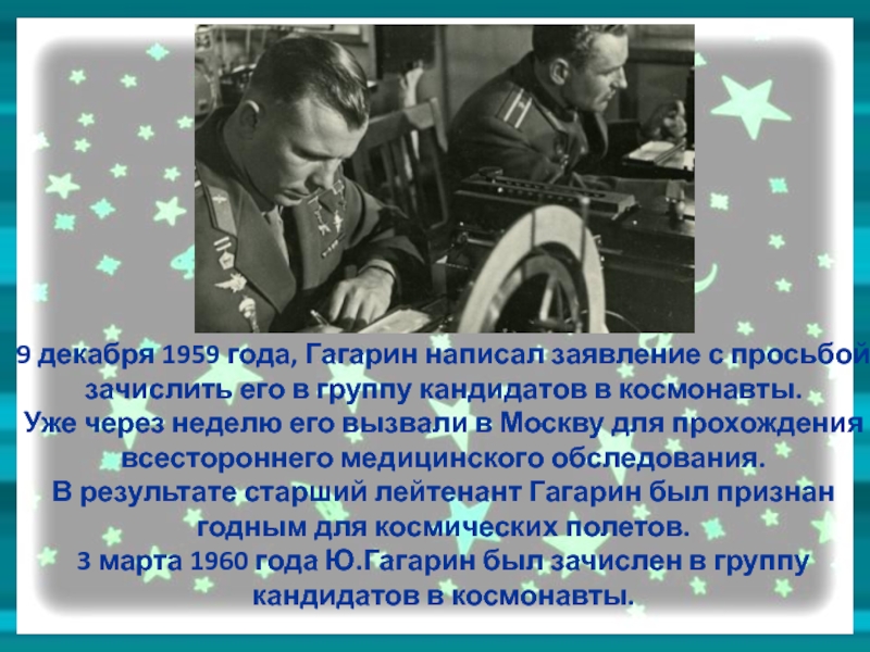 Слайд 159 декабря 1959 года, Гагарин написал заявление с просьбой зачислить его