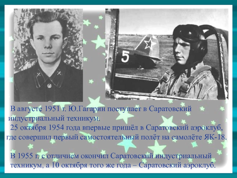 В августе 1951 г. Ю.Гагарин поступает в Саратовский  индустриальный техникум.  25 октября 1954