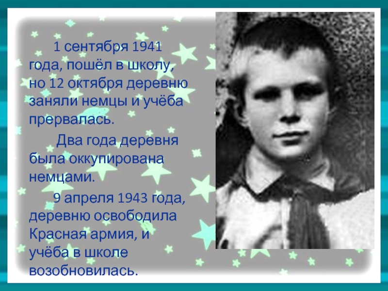 1 сентября 1941 года, пошёл в школу, но 12 октября деревню заняли немцы и учёба