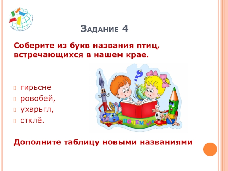 Соберите из букв названия птиц, встречающихся в нашем крае.