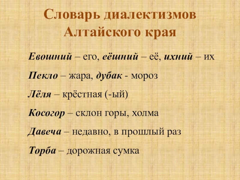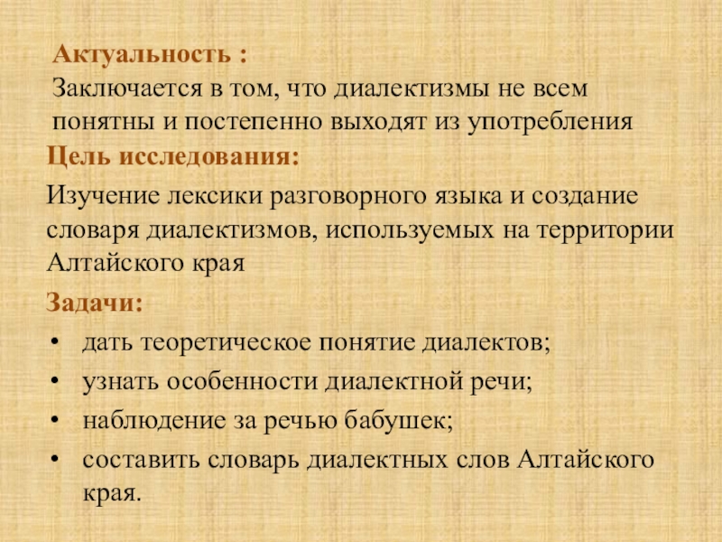 Изучение лексики разговорного языка и создание словаря диалектизмов, используемых на территории Алтайского края