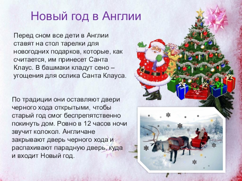 По традиции они оставляют двери черного хода открытыми, чтобы старый год смог беспрепятственно покинуть дом. Ровно в 12 часов ночи звучит колокол. Англичане закрывают дверь черного хода и распахивают парадную дверь, куда и входит Новый год.