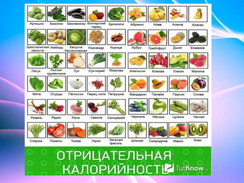 100 грамм у которых ниже, чем затраты на их усвоение. Это так называемые «продукты с отрицательной калорийностью». Так вот, таких продуктов не существует, любой продукт приносит организму какую-то энергию. Если вы ищете продукты для похудения, калорийность которых позволит поедать их в больших объемах, выбирайте овощи, фрукты, нежирное мясо и нежирные молочные продукты. А еще очень важно много двигаться и иметь позитивный настрой. Тогда ваша фигура всегда будет в идеальной форме Источник: http://pohudanie.net/pitanie/kalorijnost-produktov.php