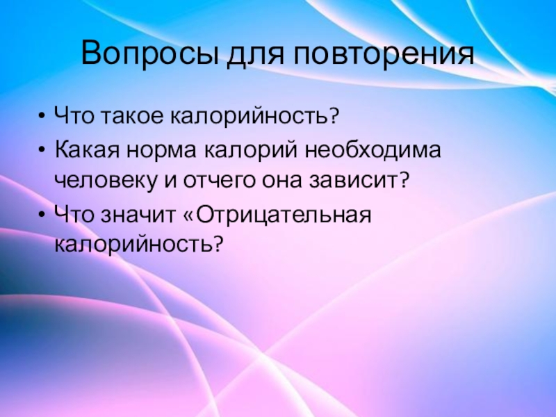 Вопросы для повторения Что такое калорийность?Какая норма калорий необходима человеку и отчего она зависит?Что значит «Отрицательная калорийность?