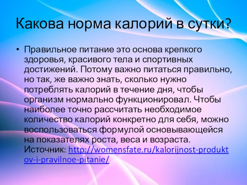 тела и спортивных достижений. Потому важно питаться правильно, но так, же важно знать, сколько нужно потреблять калорий в течение дня, чтобы организм нормально функционировал. Чтобы наиболее точно рассчитать необходимое количество калорий конкретно для себя, можно воспользоваться формулой основывающейся на показателях роста, веса и возраста. Источник: http://womensfate.ru/kalorijnost-produktov-i-pravilnoe-pitanie/