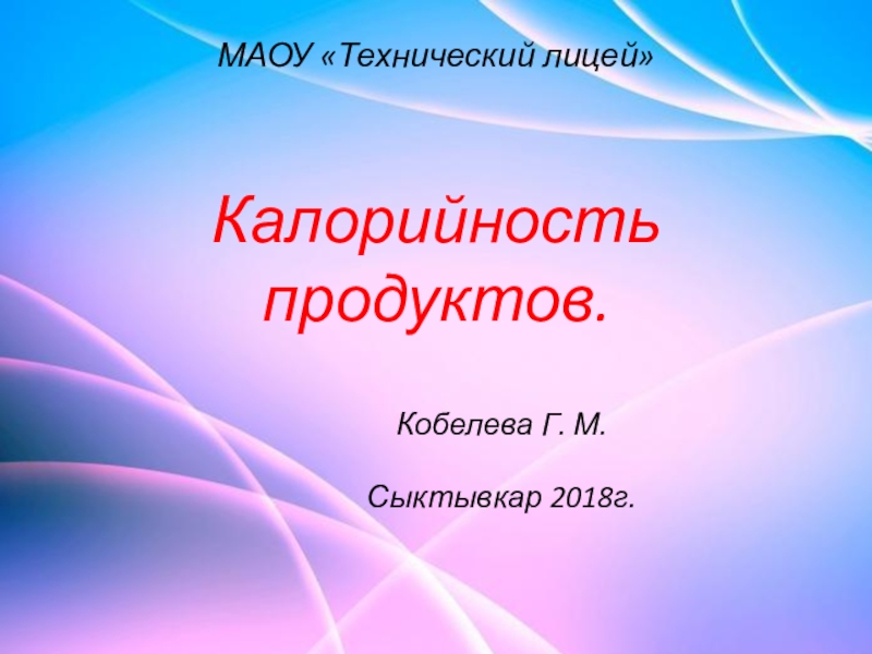 МАОУ «Технический лицей»   Калорийность продуктов.						Кобелева Г. М. 			Сыктывкар 2018г.