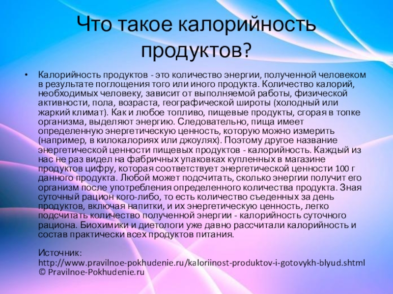 в результате поглощения того или иного продукта. Количество калорий, необходимых человеку, зависит от выполняемой работы, физической активности, пола, возраста, географической широты (холодный или жаркий климат). Как и любое топливо, пищевые продукты, сгорая в топке организма, выделяют энергию. Следовательно, пища имеет определенную энергетическую ценность, которую можно измерить (например, в килокалориях или джоулях). Поэтому другое название энергетической ценности пищевых продуктов - калорийность. Каждый из нас не раз видел на фабричных упаковках купленных в магазине продуктов цифру, которая соответствует энергетической ценности 100 г данного продукта. Любой может подсчитать, сколько энергии получит его организм после употребления определенного количества продукта. Зная суточный рацион кого-либо, то есть количество съеденных за день продуктов, включая напитки, и их энергетическую ценность, легко подсчитать количество полученной энергии - калорийность суточного рациона. Биохимики и диетологи уже давно рассчитали калорийность и состав практически всех продуктов питания. Источник: http://www.pravilnoe-pokhudenie.ru/kaloriinost-produktov-i-gotovykh-blyud.shtml © Pravilnoe-Pokhudenie.ru