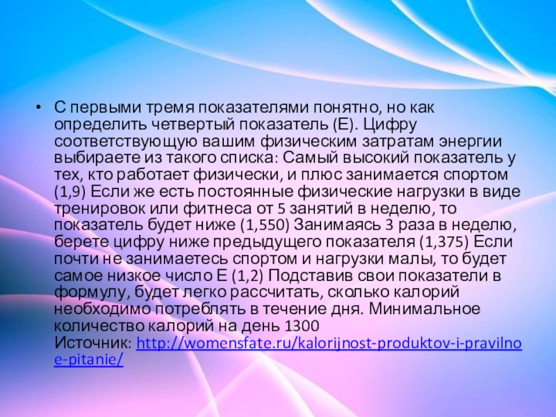 С первыми тремя показателями понятно, но как определить четвертый показатель (Е). Цифру соответствующую вашим физическим затратам энергии