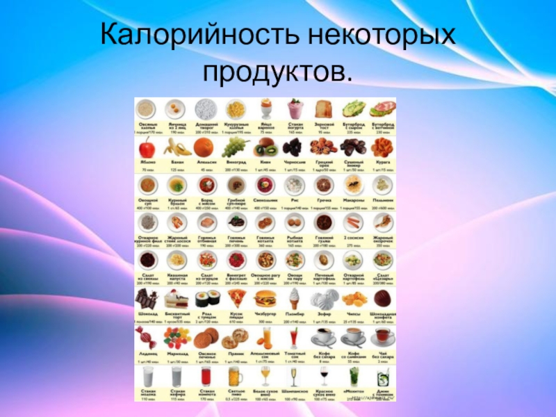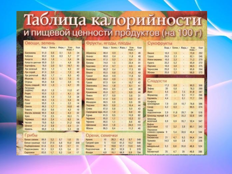 Презентация, доклад Калорийность продуктов 11 класс предмет Основы кулинарии