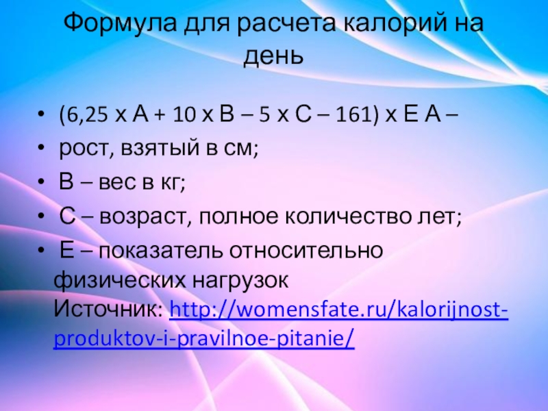 Формула для расчета калорий на день  (6,25 х А + 10 х В – 5 х