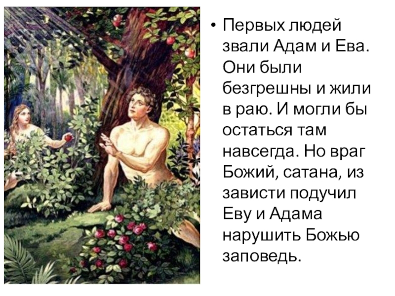 Слайд 4Первых людей звали Адам и Ева. Они были безгрешны и жили