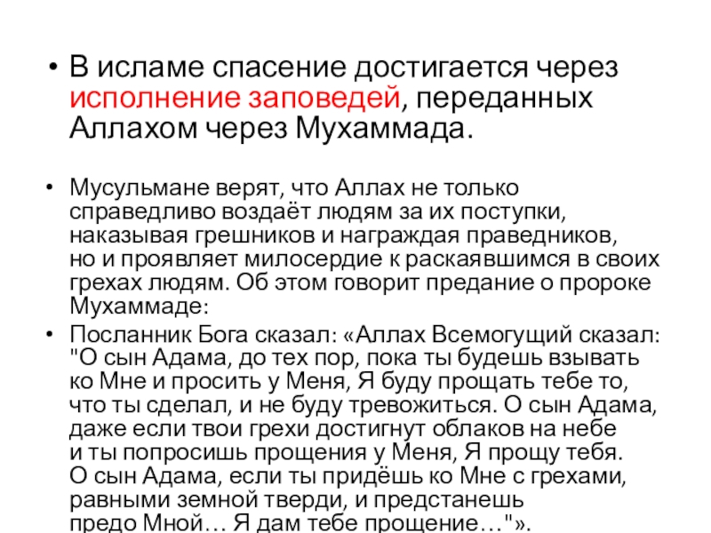 Слайд 11В исламе спасение достигается через исполнение заповедей, переданных Аллахом через Мухаммада.
