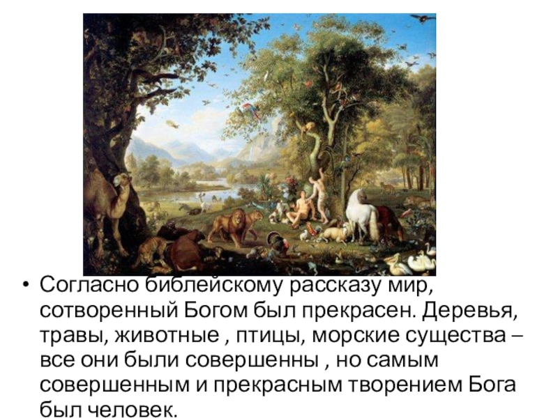 Слайд 3Согласно библейскому рассказу мир, сотворенный Богом был прекрасен. Деревья, травы, животные