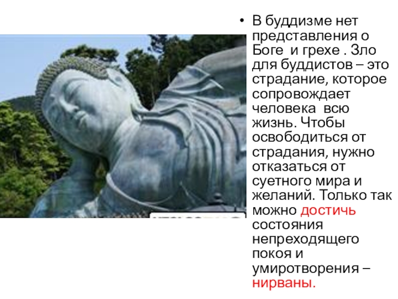 Слайд 14В буддизме нет представления о Боге и грехе . Зло для