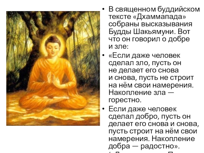 Слайд 13В священном буддийском тексте «Дхаммапада» собраны высказывания Будды Шакьямуни. Вот что он