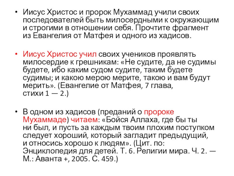 в отношении себя. Прочтите фрагмент из Евангелия от Матфея и одного из хадисов.