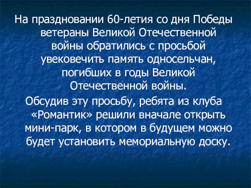 На праздновании 60-летия со дня Победы ветераны Великой Отечественной войны обратились с просьбой увековечить память односельчан, погибших в годы Великой Отечественной войны.Обсудив эту просьбу, ребята из клуба «Романтик» решили вначале открыть мини-парк, в котором в будущем