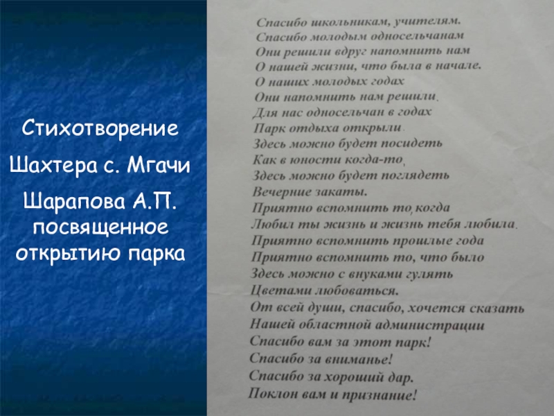 Стихотворение Шахтера с. МгачиШарапова А.П. посвященное открытию парка