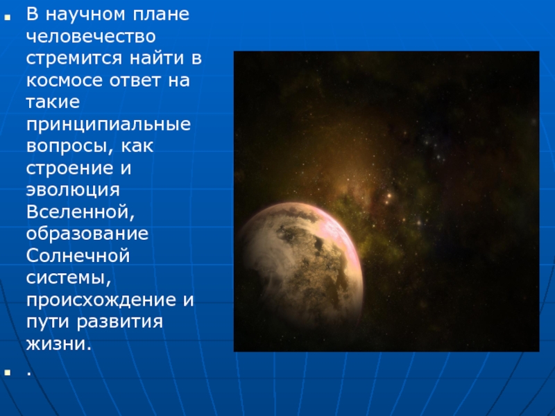 Слайд 5В научном плане человечество стремится найти в космосе ответ на такие