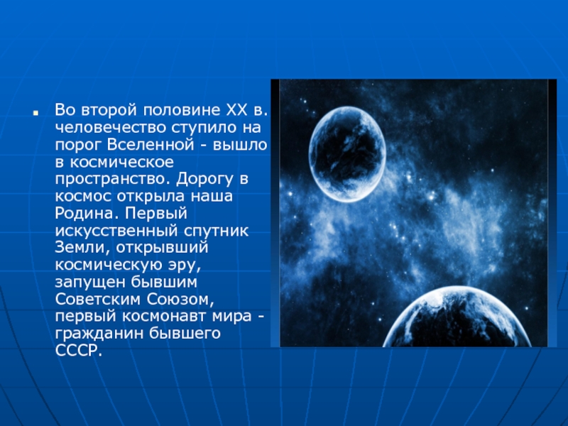 Слайд 4Во второй половине XX в. человечество ступило на порог Вселенной -