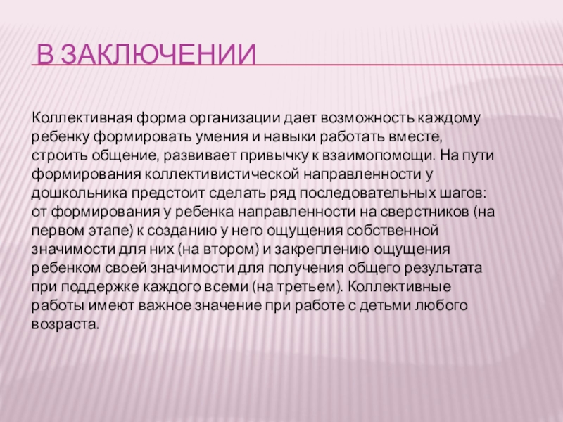 в ЗАКЛЮЧЕНИИКоллективная форма организации дает возможность каждому ребенку формировать умения и навыки работать вместе, строить общение,