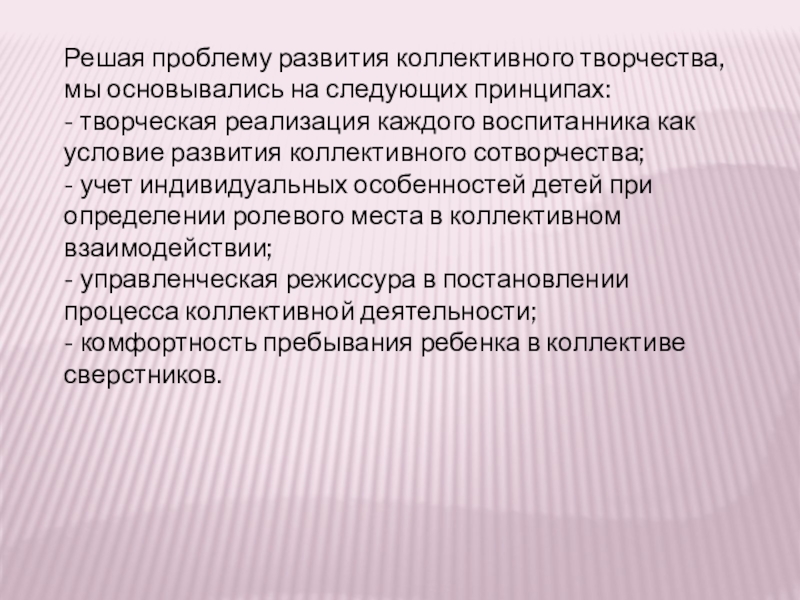 Слайд 3Решая проблему развития коллективного творчества, мы основывались на следующих принципах: