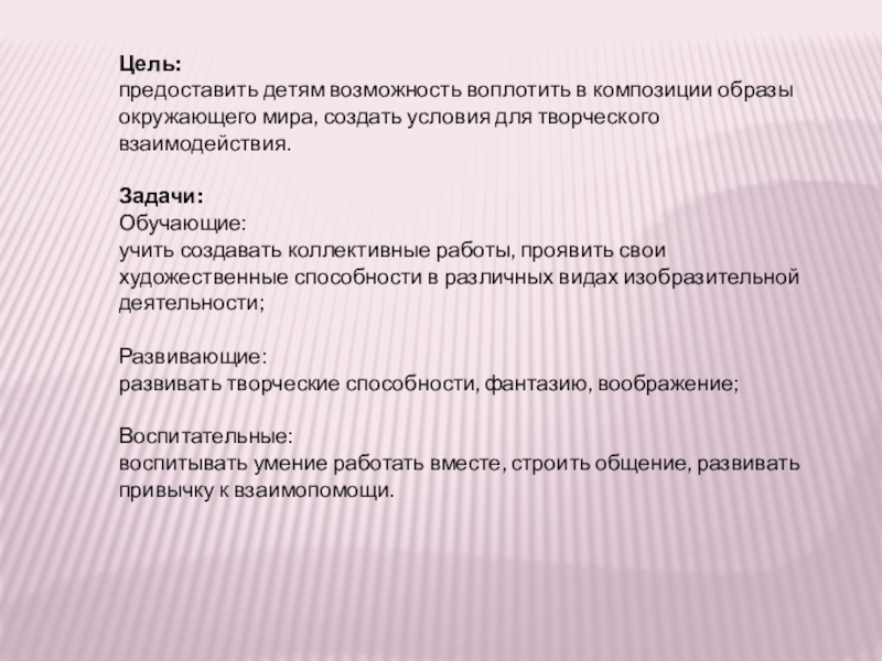Цель:  предоставить детям возможность воплотить в композиции образы окружающего мира, создать условия для творческого взаимодействия. Задачи: Обучающие: учить создавать коллективные работы, проявить свои художественные способности в различных видах изобразительной деятельности; Развивающие: развивать творческие способности,
