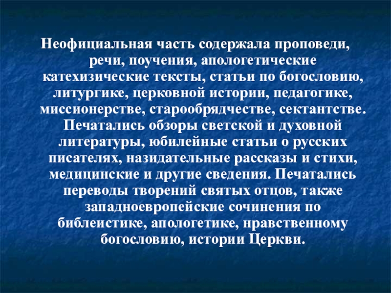 Неофициальная часть содержала проповеди, речи, поучения, апологетические катехизические тексты,