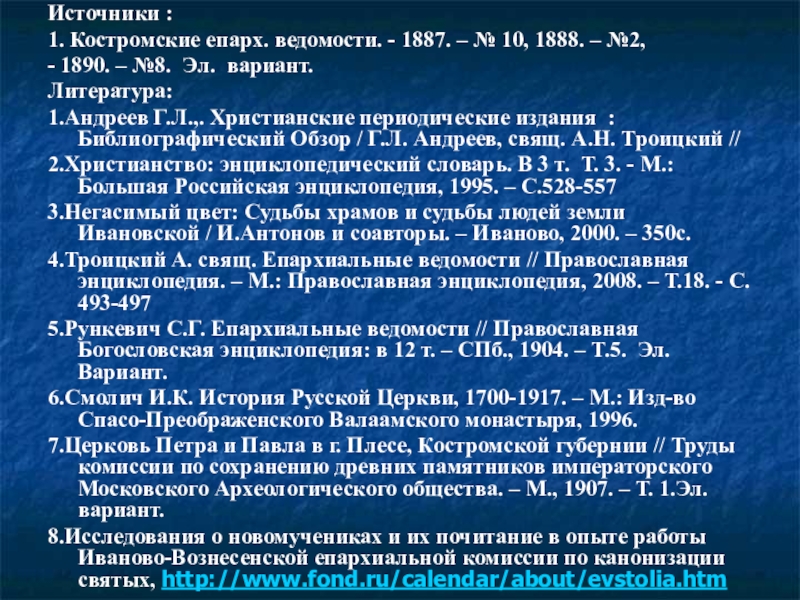 8.Исследования о новомучениках и их почитание в опыте работы Иваново-Вознесенской епархиальной комиссии по канонизации святых, http://www.fond.ru/calendar/about/evstolia.htm
