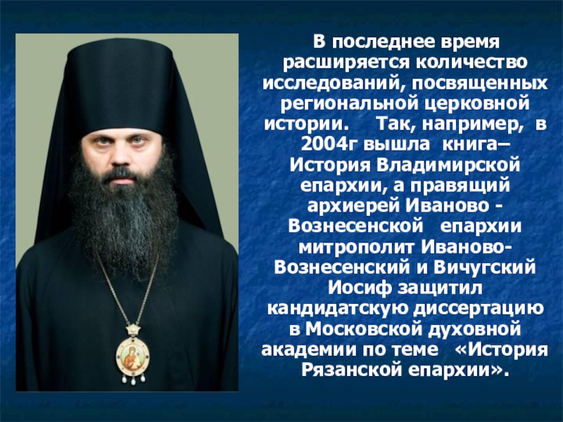 церковной истории. Так, например, в 2004г вышла книга– История Владимирской епархии, а правящий архиерей Иваново - Вознесенской епархии митрополит Иваново- Вознесенский и Вичугский Иосиф защитил кандидатскую диссертацию в Московской духовной академии по теме «История Рязанской епархии».