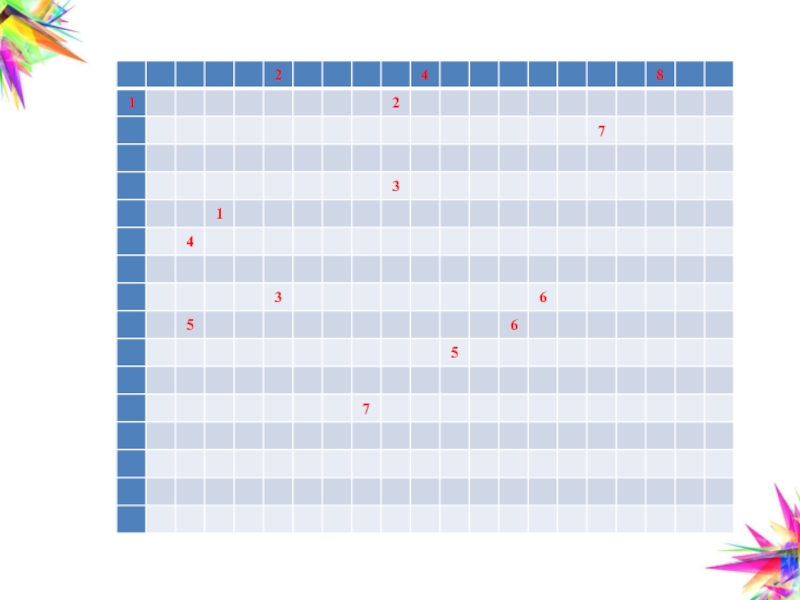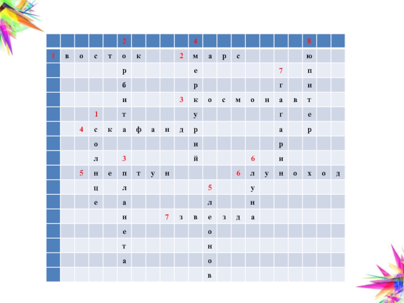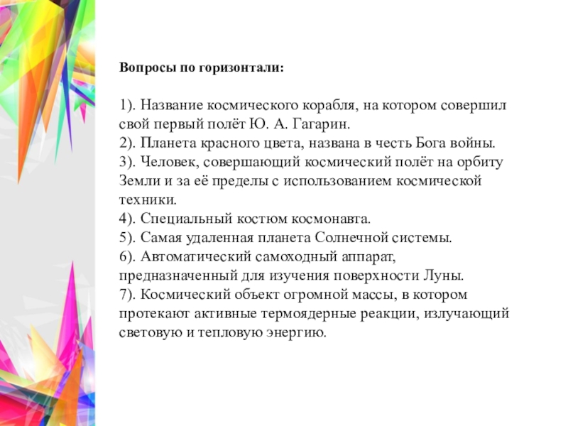 Вопросы по горизонтали: 1). Название космического корабля, на котором совершил свой первый полёт Ю. А. Гагарин. 2).