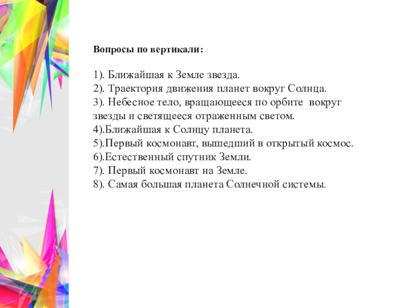 Вопросы по вертикали: 1). Ближайшая к Земле звезда. 2). Траектория движения планет вокруг Солнца. 3). Небесное тело,