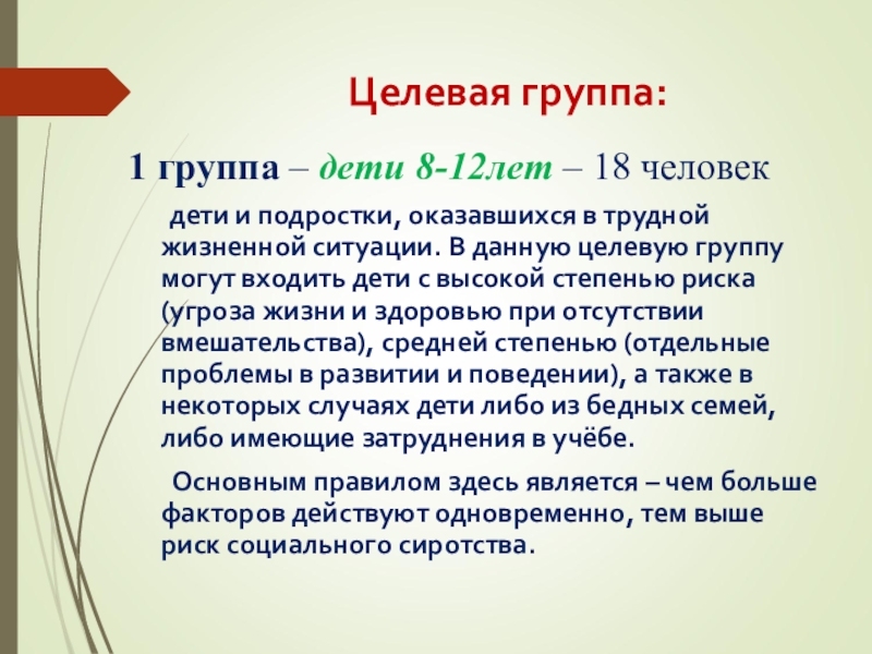 дети и подростки, оказавшихся в трудной жизненной ситуации. В данную целевую группу могут входить дети с высокой степенью риска (угроза жизни и здоровью при отсутствии вмешательства), средней степенью (отдельные проблемы в развитии и поведении), а также в некоторых случаях дети либо из бедных семей, либо имеющие затруднения в учёбе.