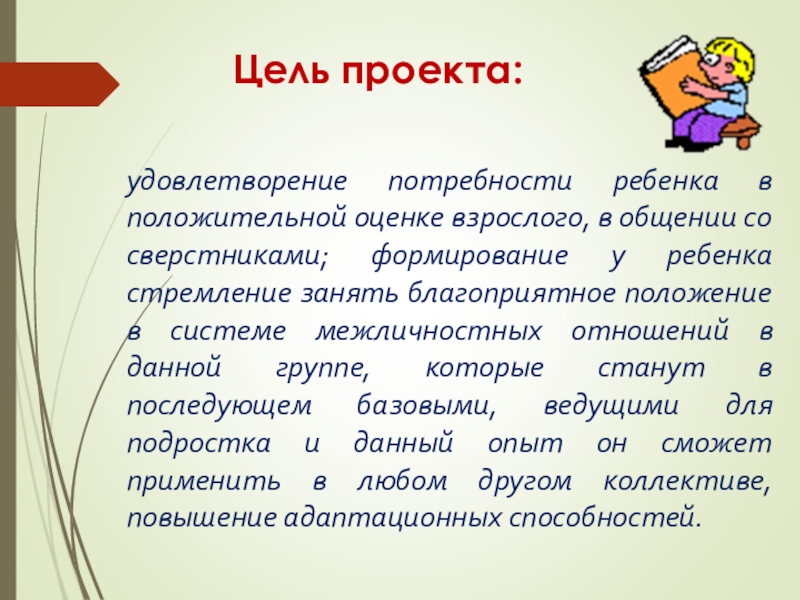 сверстниками; формирование у ребенка стремление занять благоприятное положение в системе межличностных отношений в данной группе, которые станут в последующем базовыми, ведущими для подростка и данный опыт он сможет применить в любом другом коллективе, повышение адаптационных способностей.