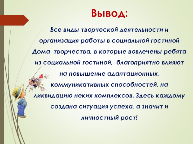 Дома творчества, в которые вовлечены ребята из социальной гостиной, благоприятно влияют на повышение адаптационных, коммуникативных способностей, на ликвидацию неких комплексов. Здесь каждому создана ситуация успеха, а значит и личностный рост!