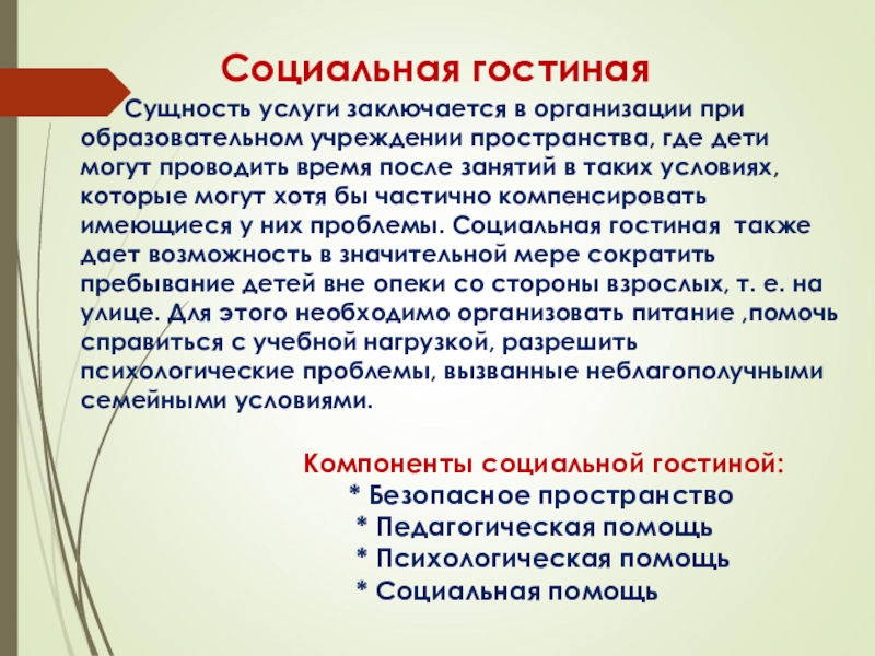 заключается в организации при образовательном учреждении пространства, где дети могут проводить время после занятий в таких условиях, которые могут хотя бы частично компенсировать имеющиеся у них проблемы. Социальная гостиная также дает возможность в значительной мере сократить пребывание детей вне опеки со стороны взрослых, т. е. на улице. Для этого необходимо организовать питание ,помочь справиться с учебной нагрузкой, разрешить психологические проблемы, вызванные неблагополучными семейными условиями.