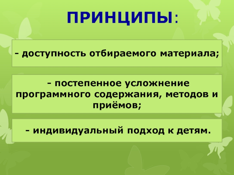 - постепенное усложнение программного содержания, методов и приёмов;