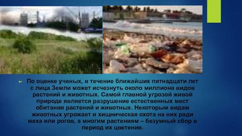 может исчезнуть около миллиона видов растений и животных. Самой главной угрозой живой природе является разрушение естественных мест обитания растений и животных. Некоторым видам животных угрожает и хищническая охота на них ради меха или рогов, а многим растениям – безумный сбор в период их цветения.